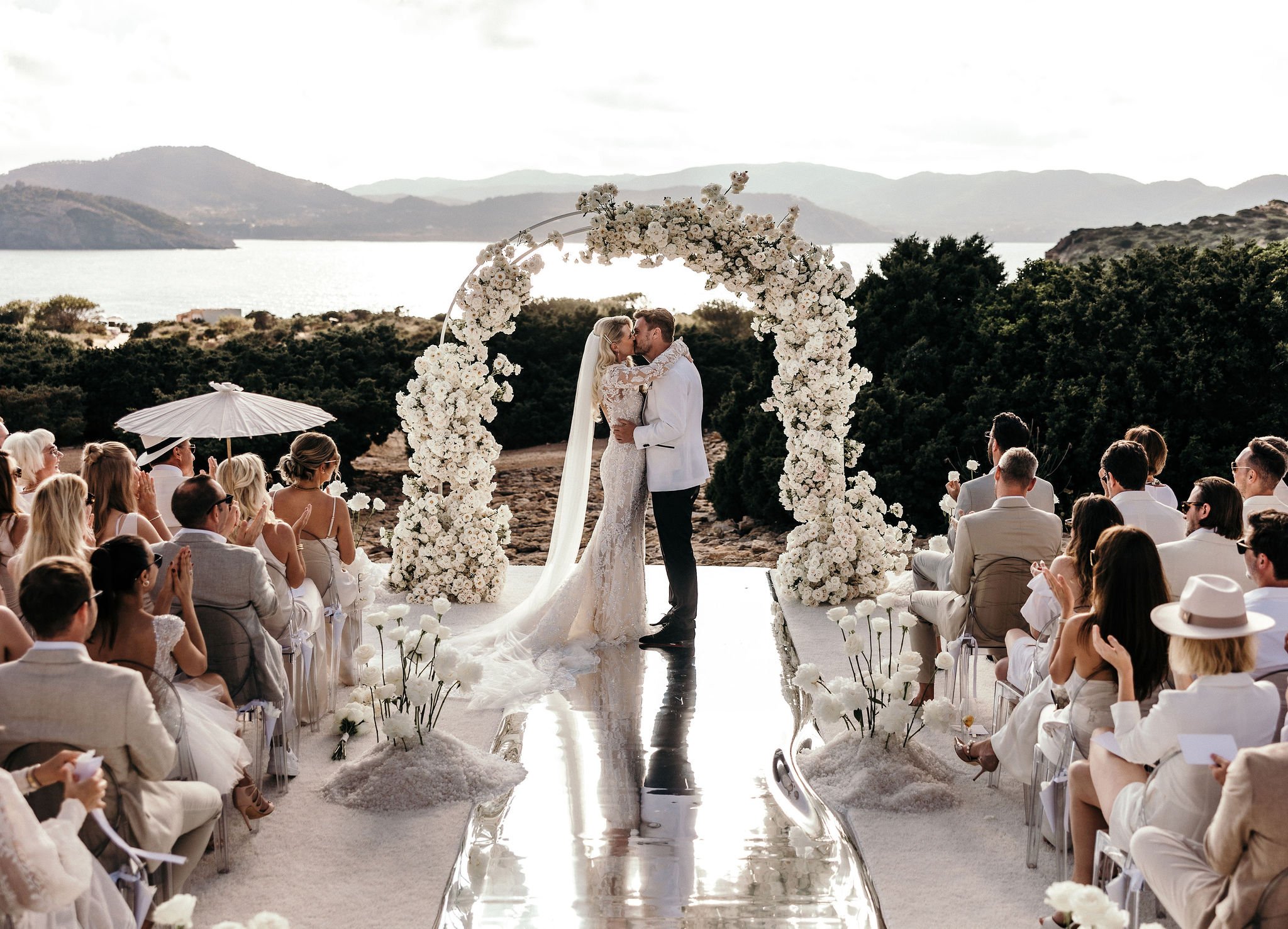 The design was a masterclass in curated luxury. Décor styling by Velvet Circus Ibiza alongside Sophie Puhlmann transformed the island into a vision of modern elegance — white textures layered with crystal accents, sculptural elements, and bespoke details that made the island feel both intimate and cinematic. Seating by Ibiza Chair Company completed the ceremony and dining spaces with clean, contemporary lines.